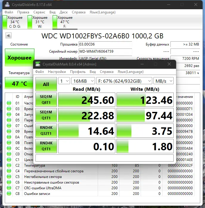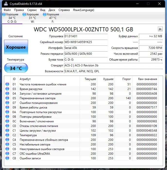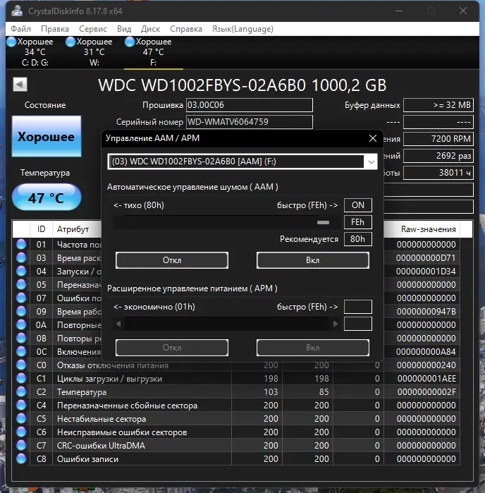 После запуска приложение автоматически определяет все подключённые диски и отображает их основные характеристики: модель, объём, интерфейс подключения, версию прошивки и серийный номер. Пользователь может перейти к детальному анализу каждого параметра S.M.A.R.T., чтобы как проверить, не превышены ли критические значения. Температура отображается отдельно, с цветовой индикацией перегрева. Доступны настройки акустического режима (AAM) и управления энергопотреблением (APM), что полезно для внешних устройств. Графики позволяют наблюдать за динамикой изменения состояния диска за выбранный период. Интерфейс легко адаптируется под предпочтения — можно выбрать тему, язык и формат отображения.