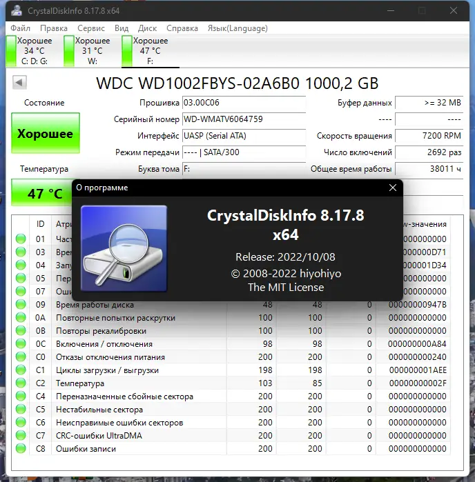 CrystalDiskInfo — это бесплатное программное обеспечение, разработанное для диагностики и контроля состояния запоминающих устройств. Оно считывает данные S.M.A.R.T., анализирует их и выводит пользователю понятную оценку «здоровья» диска. Приложение поддерживает как внутренние, так и внешние накопители, включая модели с интерфейсами USB и IEEE 1394. Каждый атрибут, от скорости вращения шпинделя до количества циклов включения, отображается в реальном времени. Это помогает оценить износ устройства и спрогнозировать его оставшийся срок службы.