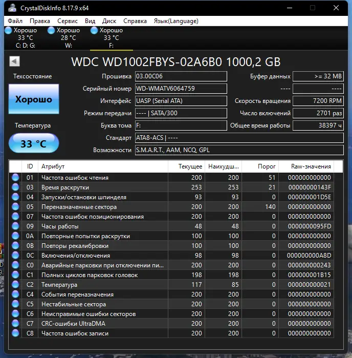 CrystalDiskInfo — это бесплатное программное обеспечение, предназначенное для диагностики и анализа состояния жёстких дисков и твердотельных накопителей. Она считывает данные S.M.A.R.T., интерпретирует их и выводит пользователю понятную сводку о «здоровье» каждого устройства. Программа работает в фоне, не нагружая систему, и может запускаться как в обычном, так и в portable-режиме, что особенно удобно при диагностике чужого компьютера. Поддержка различных интерфейсов, включая SATA, IDE, USB и IEEE 1394, расширяет сферу её применения. Пользователь получает доступ к данным о времени наработки, количестве циклов включения, температуре и других ключевых параметрах.