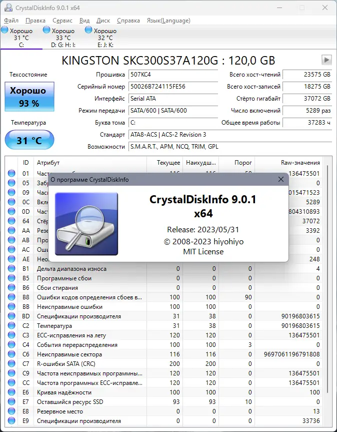 CrystalDiskInfo — это утилита для мониторинга состояния жёстких дисков и твердотельных накопителей, использующая технологию S.M.A.R.T. для оценки работоспособности и прогнозирования возможных сбоев. Программа предоставляет детальную информацию о температуре, времени работы, количестве включений и состоянии секторов, позволяя заранее выявить потенциальные проблемы с накопителями.