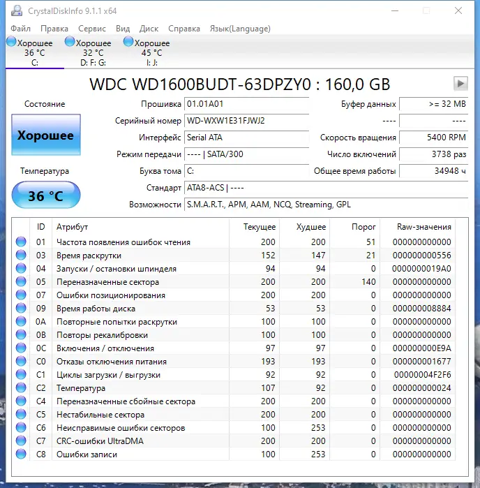 CrystalDiskInfo — это утилита для мониторинга состояния жёстких дисков и SSD, поддерживающих технологию S.M.A.R.T. Программа отображает температуру, уровень износа, время работы и другие важные параметры накопителей. Она помогает вовремя выявить потенциальные неисправности и предотвратить потерю данных. Инструмент поддерживает локализацию, включая интерфейс на русском языке, и совместим с различными типами дисков. Утилита работает как с внутренними, так и с внешними устройствами, включая те, что подключаются через USB или IEEE 1394. Программу можно использовать в стационарном и portable-режиме, что делает её удобной для диагностики на разных компьютерах. С её помощью можно легко как проверить состояние диска, так и отследить динамику изменений во времени.