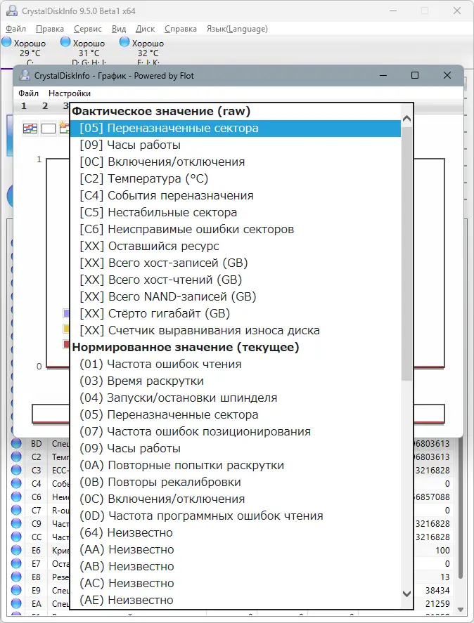 После запуска CrystalDiskInfo автоматически определяет все подключённые диски и отображает их в главном окне. Пользователь видит общую оценку состояния каждого устройства, цветовую индикацию (зелёный — норма, жёлтый — предупреждение, красный — критично), а также детальные значения атрибутов S.M.A.R.T. Можно переключаться между дисками, просматривать их температуру, время наработки, количество циклов включения и другие метрики. Для более глубокого анализа доступны вкладки с графиками, где отображается динамика изменения ключевых показателей. Настройки позволяют включить автозапуск, оповещения, выбрать тему интерфейса и язык. Чтобы как проверить состояние ssd, достаточно запустить программу и посмотреть оценку здоровья и текущую температуру.