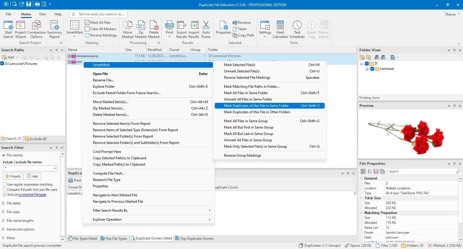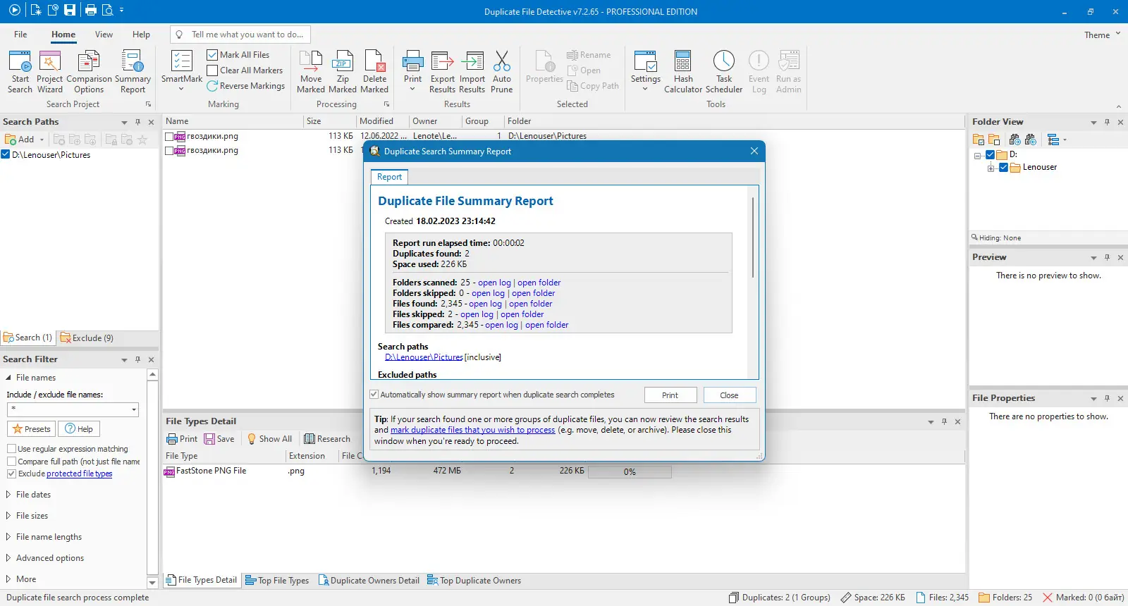 - Высокая точность обнаружения дубликатов за счет анализа содержимого и побайтового сравнения.
