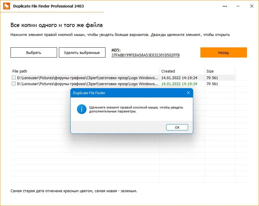 - Поиск дубликатов по хэшу MD5 для максимальной точности