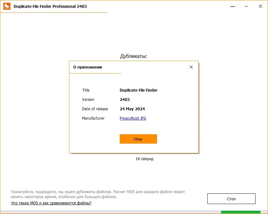 Duplicate File Finder — это инструмент для поиска и удаления повторяющихся файлов на жёстком диске. Программа сканирует выбранные папки с помощью алгоритма хэширования MD5, обеспечивая точное сравнение по содержимому, а не по названию. Процесс анализа проходит быстро, а интерфейс позволяет легко управлять найденными дубликатами.