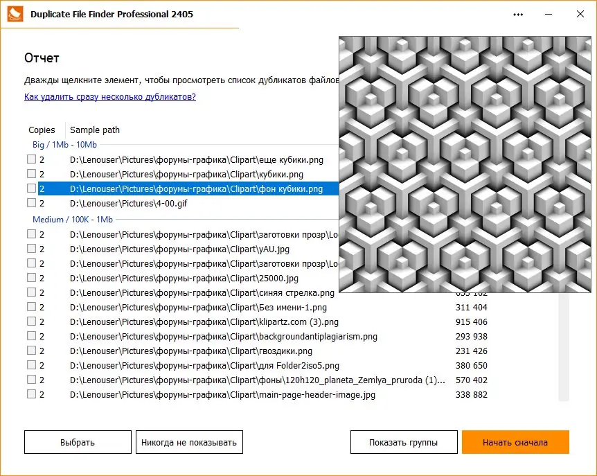 Использование программы начинается с выбора папок для анализа. После запуска пользователь указывает интересующие директории или оставляет стандартные настройки. Запускается процесс хеширования каждого файла, при этом задействуется оптимизированный алгоритм MD5, позволяющий достичь высокой скорости. По завершении сканирования дубликаты группируются по схожести, и пользователь может вручную выбрать, какие копии следует удалить. Также доступен режим предварительного просмотра для проверки содержимого перед очисткой.