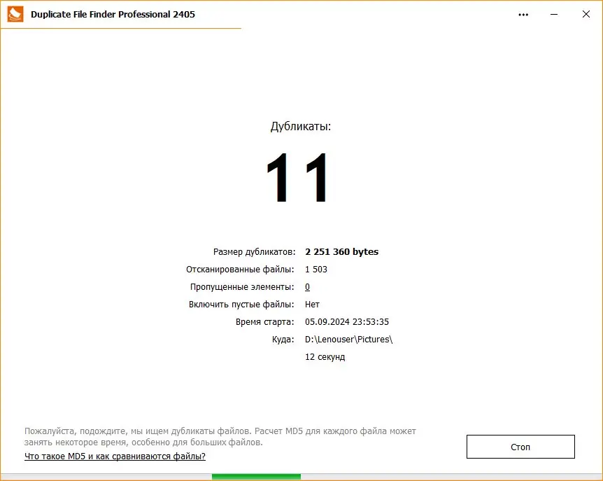 Duplicate File Finder — это инструмент для поиска и удаления повторяющихся файлов на жёстком диске. Программа анализирует выбранные папки с помощью алгоритма хеширования MD5, обеспечивая высокую точность обнаружения дубликатов по содержимому, а не по названию. Процесс сканирования занимает считанные секунды, а удобный интерфейс позволяет быстро оценить результаты и освободить место на диске.