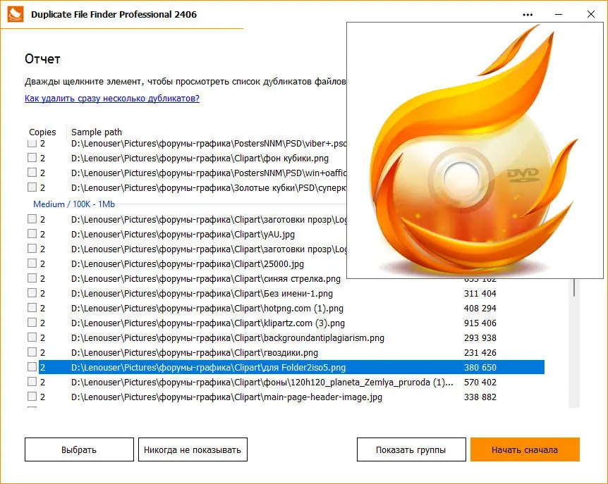 - Удобный интерфейс для просмотра и удаления дубликатов