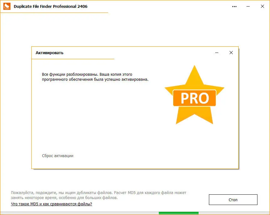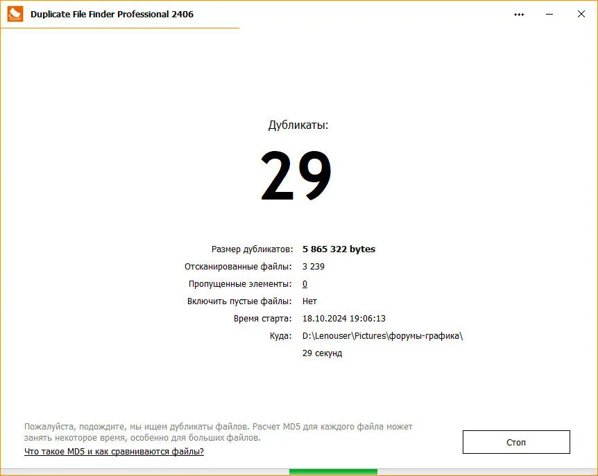 Duplicate File Finder — это утилита для поиска и удаления повторяющихся файлов на жёстком диске. Программа сканирует выбранные папки с помощью алгоритма MD5, выявляя дубликаты по содержимому, а не по названию. Процесс анализа занимает считанные секунды, обеспечивая быструю и точную очистку дискового пространства.