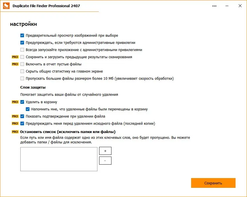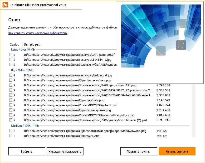 - Удаление дубликатов в один клик с возможностью предварительного просмотра
