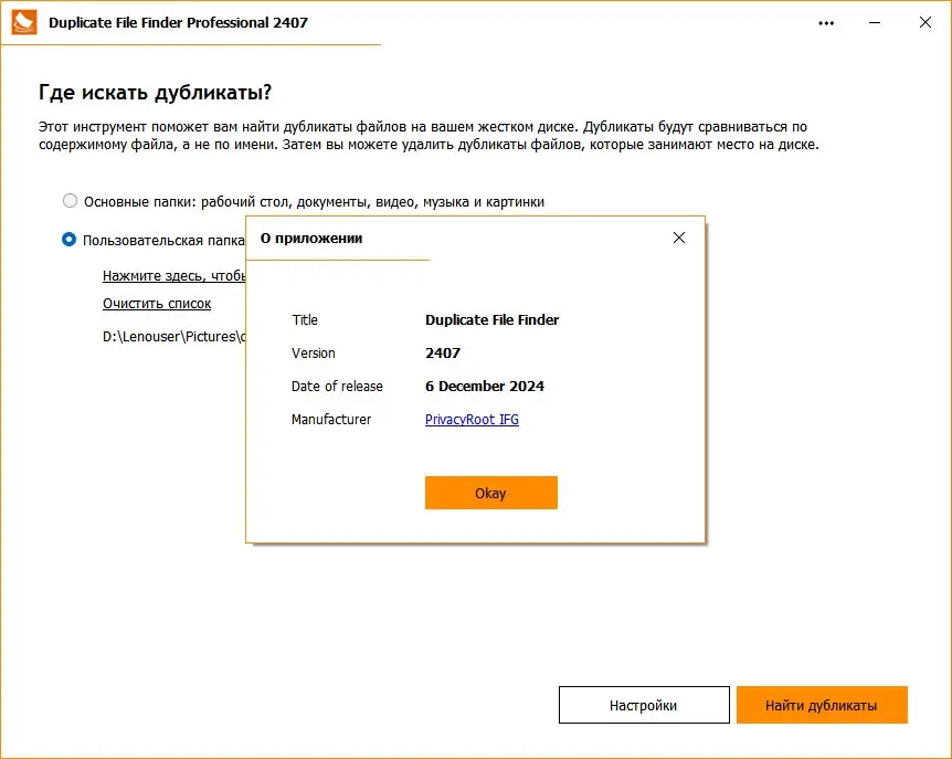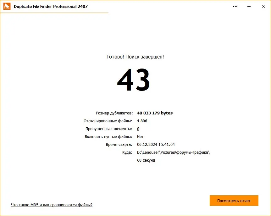 Duplicate File Finder — это инструмент для поиска и удаления повторяющихся файлов на жёстком диске. Программа сканирует выбранные папки с высокой скоростью, используя алгоритм хэширования MD5 для точного сравнения содержимого. Работает на всех актуальных версиях Windows, интерфейс доступен на русском языке.