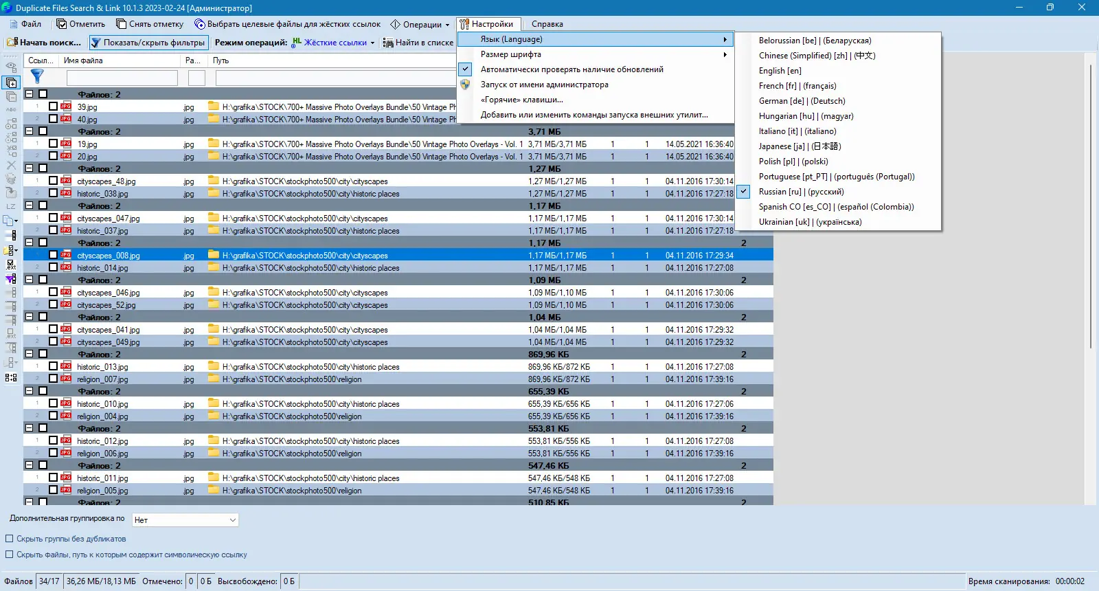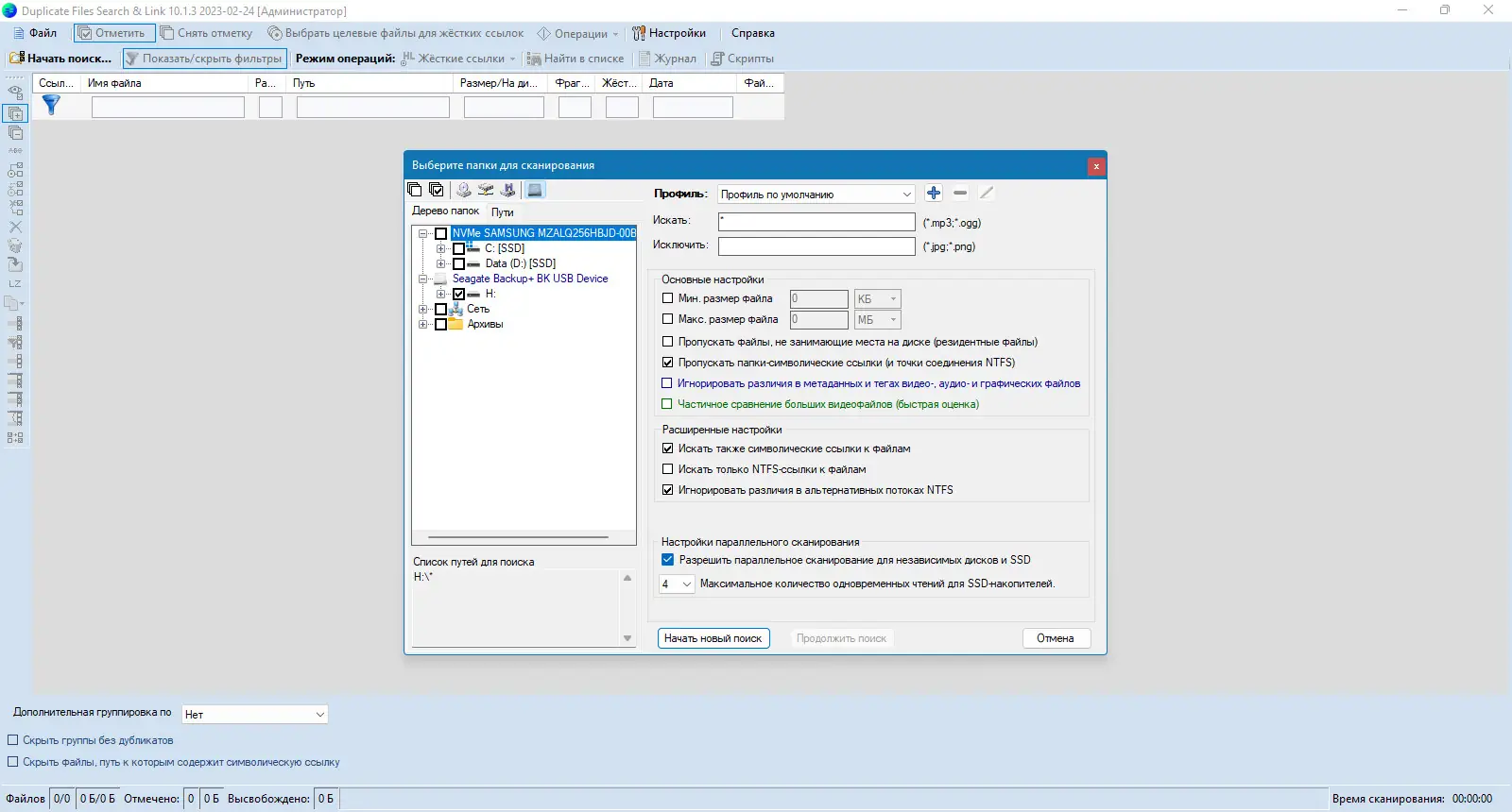 Для начала работы необходимо указать каталоги или диски, которые следует просканировать на наличие дубликатов. Программа запускает многопоточный анализ, одновременно обрабатывая файлы с нескольких физических накопителей. После завершения поиска отображаются группы идентичных файлов, где пользователь может выбрать, какие копии оставить, а какие заменить ссылками.