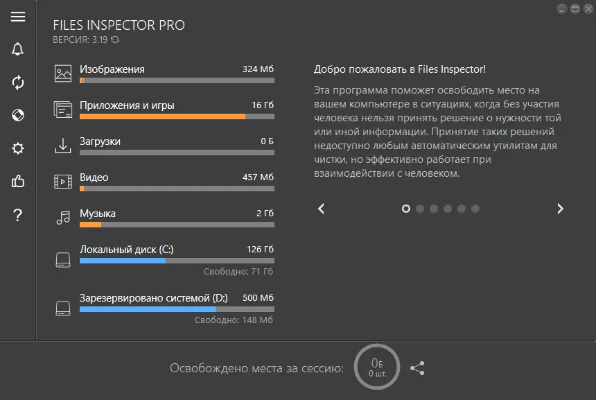 Files Inspector разработан для тех, кто сталкивается с нехваткой свободного места на диске и хочет понять, какие именно данные его занимают. Утилита проводит экспресс-анализ пользовательских папок — документов, изображений, видео, музыки и других, отображая объём, занимаемый каждым типом файлов. Это позволяет быстро определить, где скопилось больше всего данных, и принять решение об их удалении или переносе.