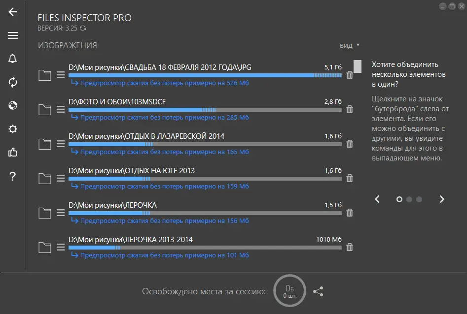 - Поддерживает экспресс-анализ пользовательских папок — документов, изображений, видео и музыки — для быстрой оценки их влияния на свободное место.