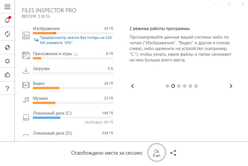 После запуска программы пользователь может выбрать режим проверки — экспресс-анализ или полное сканирование. Экспресс-режим быстро оценивает основные папки, а расширенный анализ охватывает все разделы диска, включая скрытые и системные директории. Результаты отображаются в виде интерактивной диаграммы, где каждый сегмент соответствует определённой категории данных. Клик по элементу открывает содержимое папки, позволяя просматривать файлы и выбирать те, которые можно удалить. Удаление выполняется в один клик, а в Pro-версии доступна дополнительная функция — сжатие фото без потери качества, что позволяет дополнительно освободить до 10% места на диске. Обновление до версии 4.30 улучшило производительность при работе с большими папками и изменило систему уведомлений, сделав её менее навязчивой.