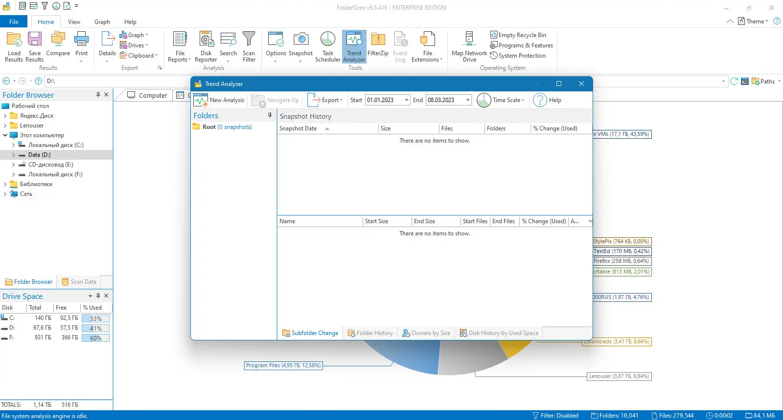 FolderSizes — это мощный инструмент для анализа использования дискового пространства, который помогает выявить крупные файлы и папки, занимающие место на жёстком диске. Программа отображает данные в виде иерархических диаграмм, предоставляет детальные отчёты и поддерживает экспорт результатов в различные форматы. Благодаря интуитивному интерфейсу и расширенным функциям, FolderSizes подходит как для домашних пользователей, так и для системных администраторов.