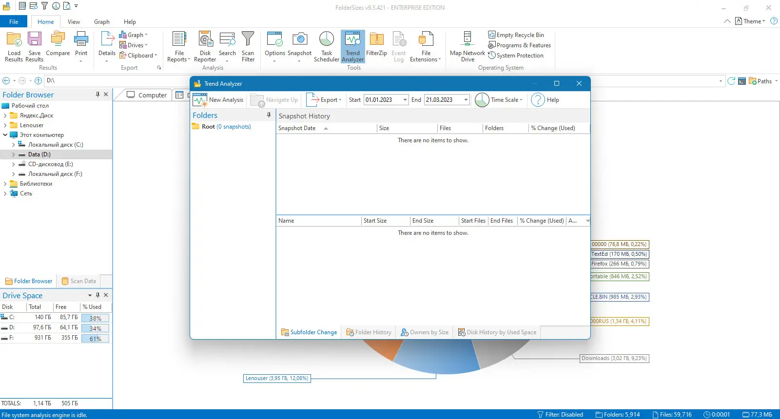 FolderSizes — это мощный инструмент для анализа использования дискового пространства, который помогает детально оценить объём данных в папках и файлах на жёстких дисках, включая локальные, съёмные и сетевые накопители. Программа предоставляет наглядные визуализации, диаграммы и отчёты, позволяя быстро выявить элементы, занимающие наибольшее количество места. С её помощью можно эффективно управлять хранением данных и поддерживать оптимальное состояние файловой системы.