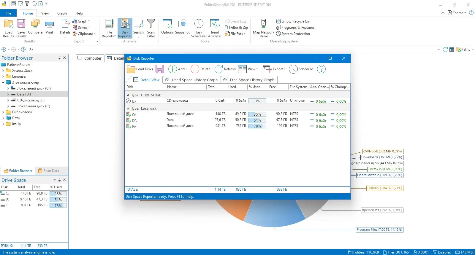 FolderSizes представляет собой программное решение, предназначенное для глубокого анализа структуры файловой системы. С его помощью можно быстро выявить «тяжёлые» директории, отслеживать использование дискового пространства по типам файлов, атрибутам и владельцам. Программа поддерживает как локальные, так и сетевые диски, обеспечивая полный контроль над хранением данных.