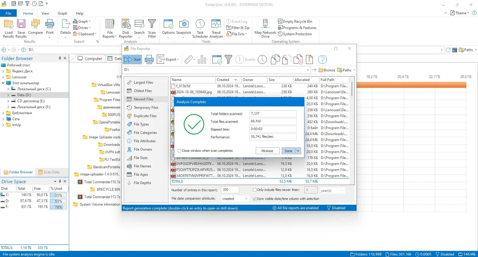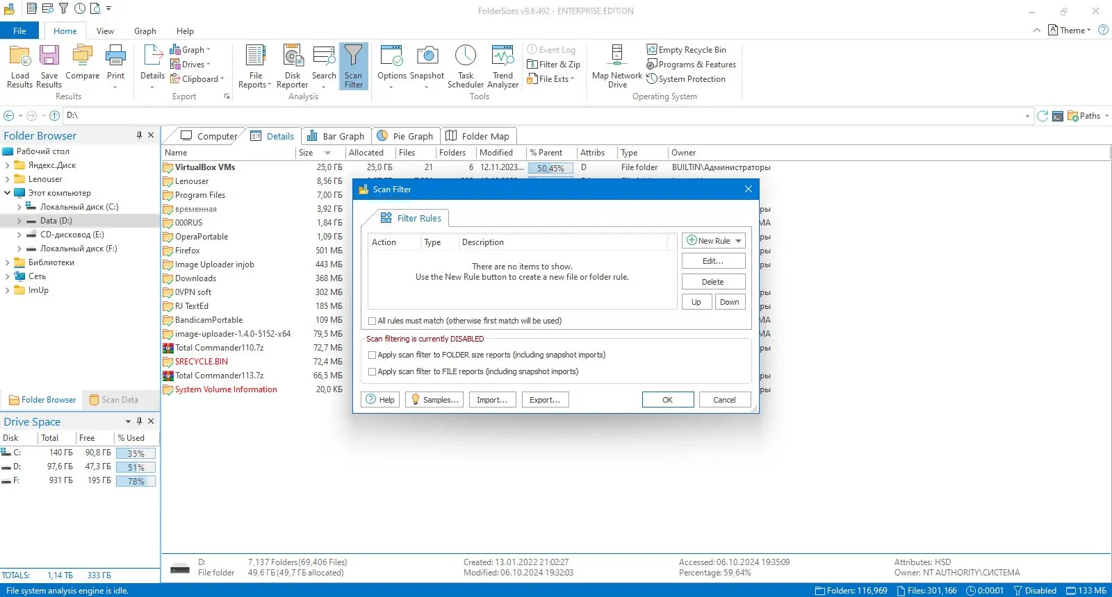Пользоваться FolderSizes просто: после запуска достаточно выбрать нужный диск или папку, и программа начнёт анализировать содержимое. В процессе сканирования отображаются размеры всех файлов и директорий, а также их количество и атрибуты. Пользователь может сортировать данные по различным параметрам, применять фильтры и строить графики. Для автоматизации используются отчёты, которые можно планировать и экспортировать в удобном формате. Поддержка перетаскивания позволяет быстро перемещать или копировать объекты, а «суперподсказки» показывают дополнительную информацию при наведении курсора. Все операции оптимизированы с помощью многопоточного механизма, что обеспечивает высокую скорость обработки даже на больших томах.