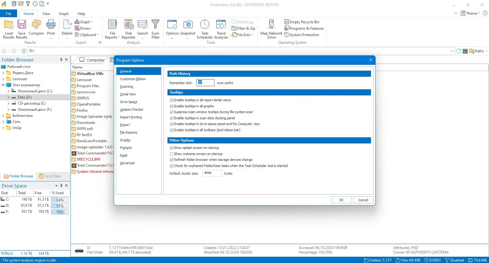 FolderSizes отличается широким функционалом и высокой производительностью, что делает его одним из лучших решений для анализа дискового пространства. Программа поддерживает современные технологии, включая работу с Unicode и длинными путями в NTFS, а также предоставляет детальные отчёты по типам файлов, их возрасту и владельцам. Однако, несмотря на все преимущества, у приложения есть и ограничения.