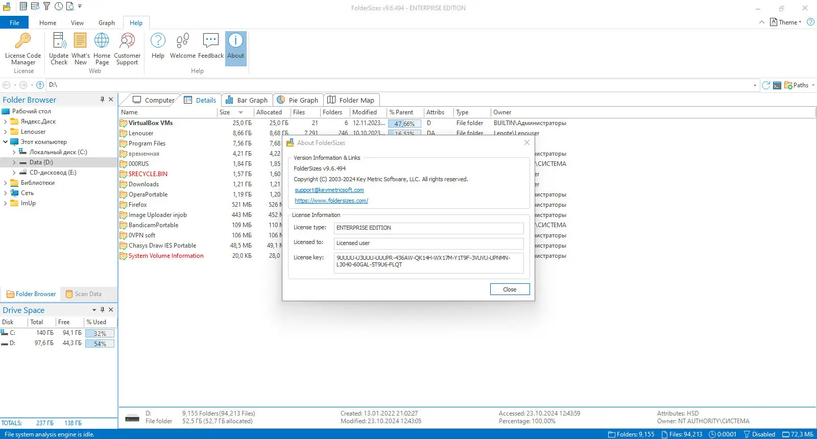 FolderSizes — это мощный инструмент для анализа использования дискового пространства, который помогает быстро выявить крупные файлы и папки, занимающие место на жёстком диске. Программа предоставляет детализированные отчёты, визуальные диаграммы и поддерживает экспорт данных, что делает её незаменимой для системного администрирования и оптимизации хранения.