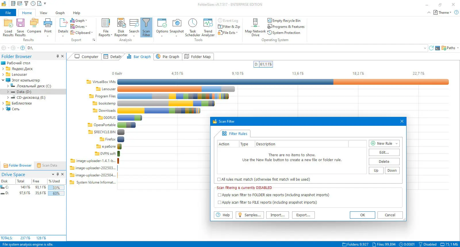 FolderSizes — это эффективное приложение для анализа использования дискового пространства, позволяющее быстро выявить крупные файлы и переполненные папки. Программа помогает освободить место на жёстком диске за счёт наглядного отображения структуры хранения данных с использованием диаграмм и отчётов.