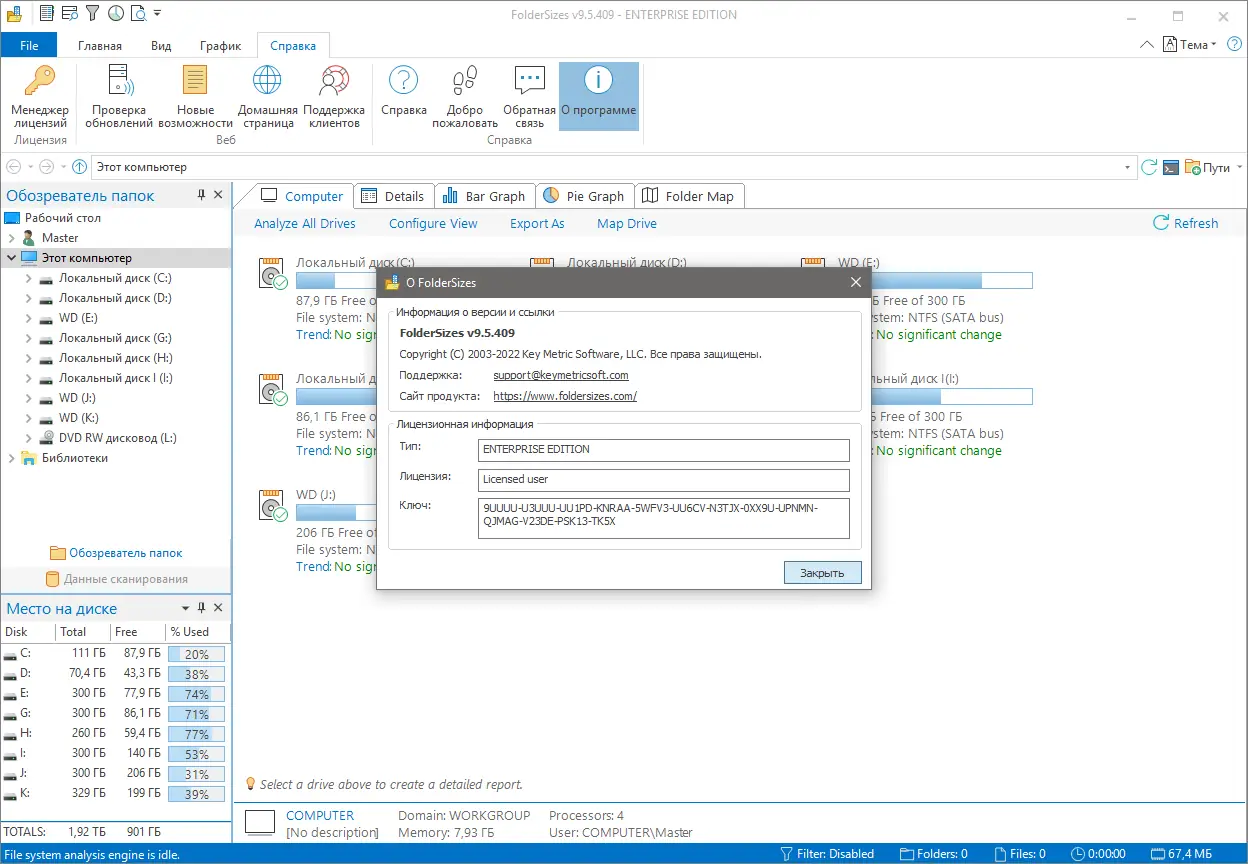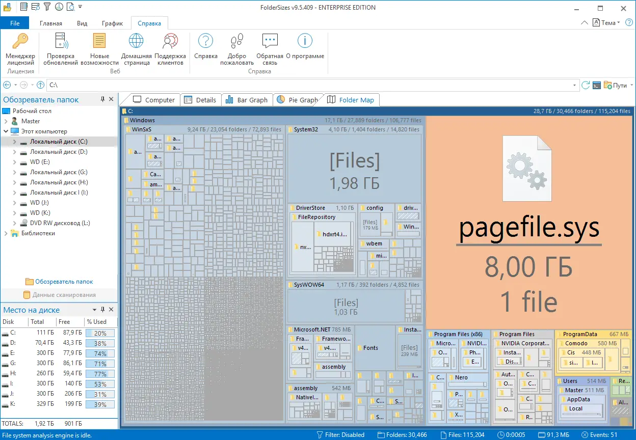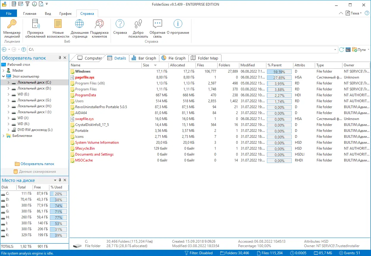 FolderSizes — это инструмент для анализа использования дискового пространства, который помогает быстро выявить крупные файлы и папки, занимающие место на жестких дисках. Программа отображает информацию в виде детальных отчетов и наглядных диаграмм, поддерживает сканирование локальных, съемных и сетевых дисков. С ее помощью можно эффективно управлять хранилищем, находить устаревшие или дублирующиеся данные, не нарушая работу системы.
