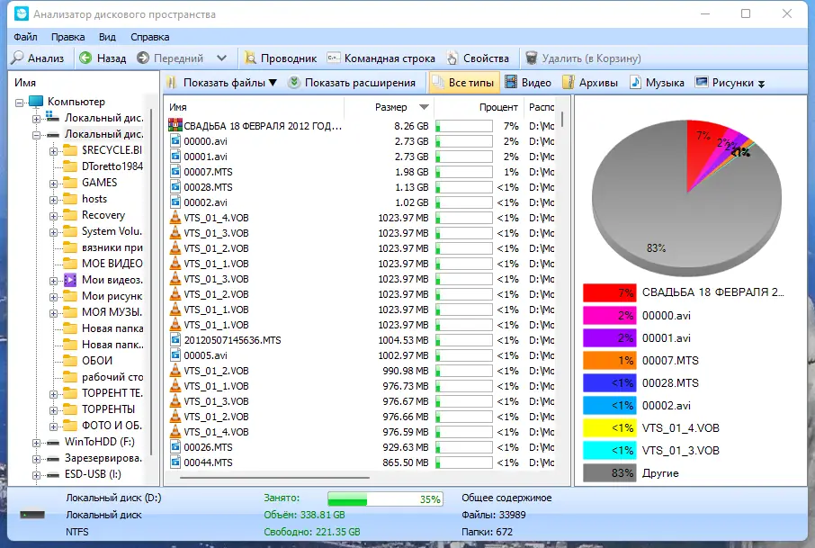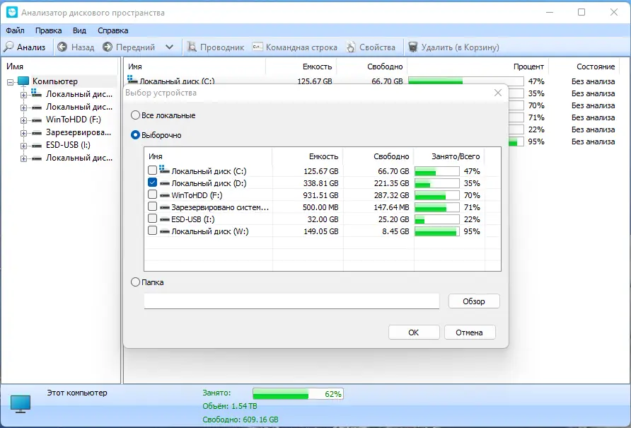 - Быстрое сканирование и анализ как отдельных папок, так и всех дисков