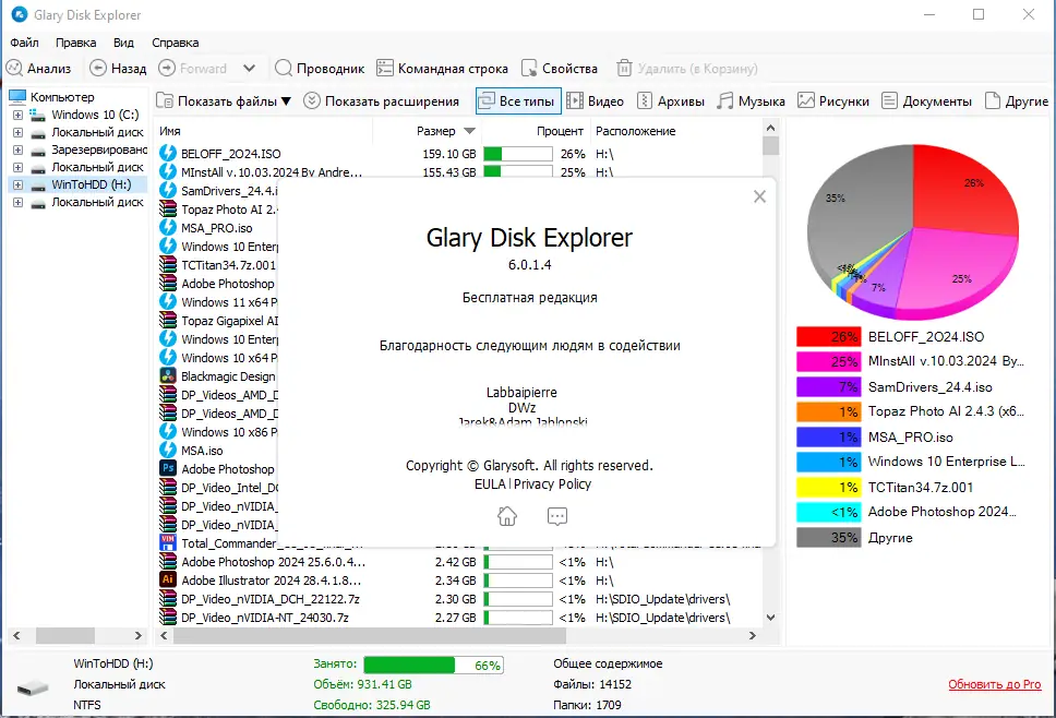 Glary Disk Explorer — это компактная и эффективная утилита для анализа занятого и свободного пространства на жёстких и съёмных дисках. Программа быстро сканирует накопители и визуализирует структуру данных, помогая выявить самые объёмные файлы и папки. Интуитивный интерфейс и функция фильтрации позволяют детально изучить содержимое дисков и оптимизировать хранение информации.