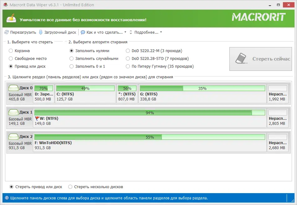 Macrorit Data Wiper — профессиональное решение для полного и безопасного удаления данных с жёстких дисков, USB-накопителей и других запоминающих устройств. Программа гарантирует необратимое уничтожение информации с использованием сертифицированных алгоритмов перезаписи. Подходит как для частных пользователей, так и для корпоративных клиентов, заботящихся о конфиденциальности.