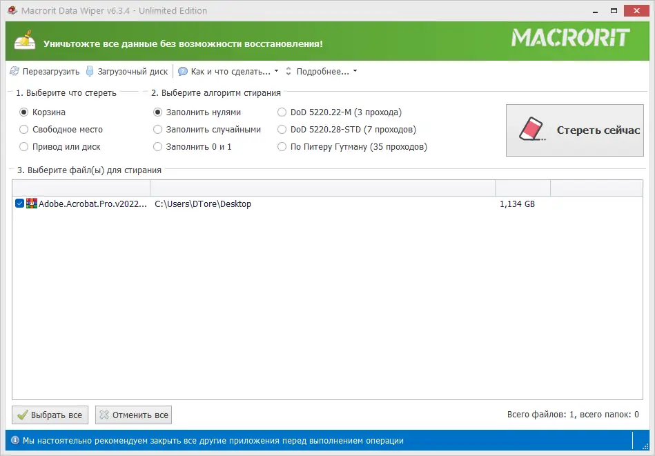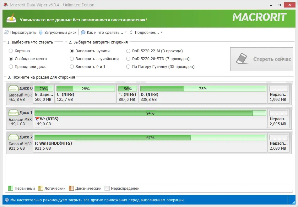 - Обеспечивает полное стирание всего диска, отдельного раздела, флеш-накопителя или внешнего HDD.