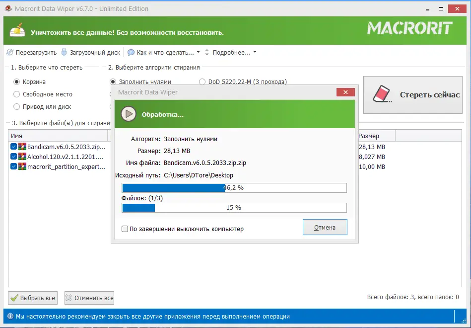 Macrorit Data Wiper — профессиональное решение для полного и безопасного удаления данных с жёстких дисков, USB-накопителей и других носителей. Программа обеспечивает безвозвратное стирание информации с применением надёжных алгоритмов перезаписи, предотвращая любые попытки восстановления. Подходит как для частных пользователей, так и для корпоративных систем, где важна защита конфиденциальной информации.
