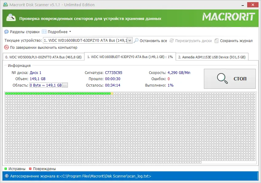 - Возможность сканирования отдельных диапазонов секторов для точечного анализа