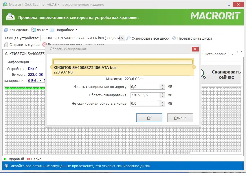 - Возможность сканирования отдельных участков диска по заданному диапазону секторов.