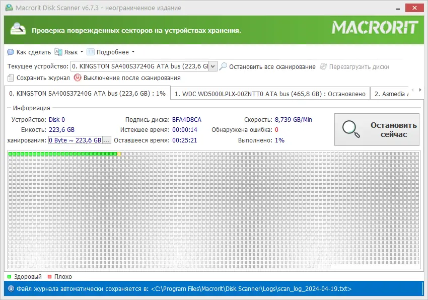 Macrorit Disk Scanner — это инструмент для проверки жёстких дисков на наличие битых секторов, позволяющий оценить общее состояние накопителя и предотвратить возможную потерю данных. Программа поддерживает различные типы дисков, включая SSD, HDD, RAID-массивы и съёмные носители, обеспечивая точное сканирование и наглядное отображение результатов. Подходит как для домашнего использования, так и для специалистов в области диагностики оборудования.