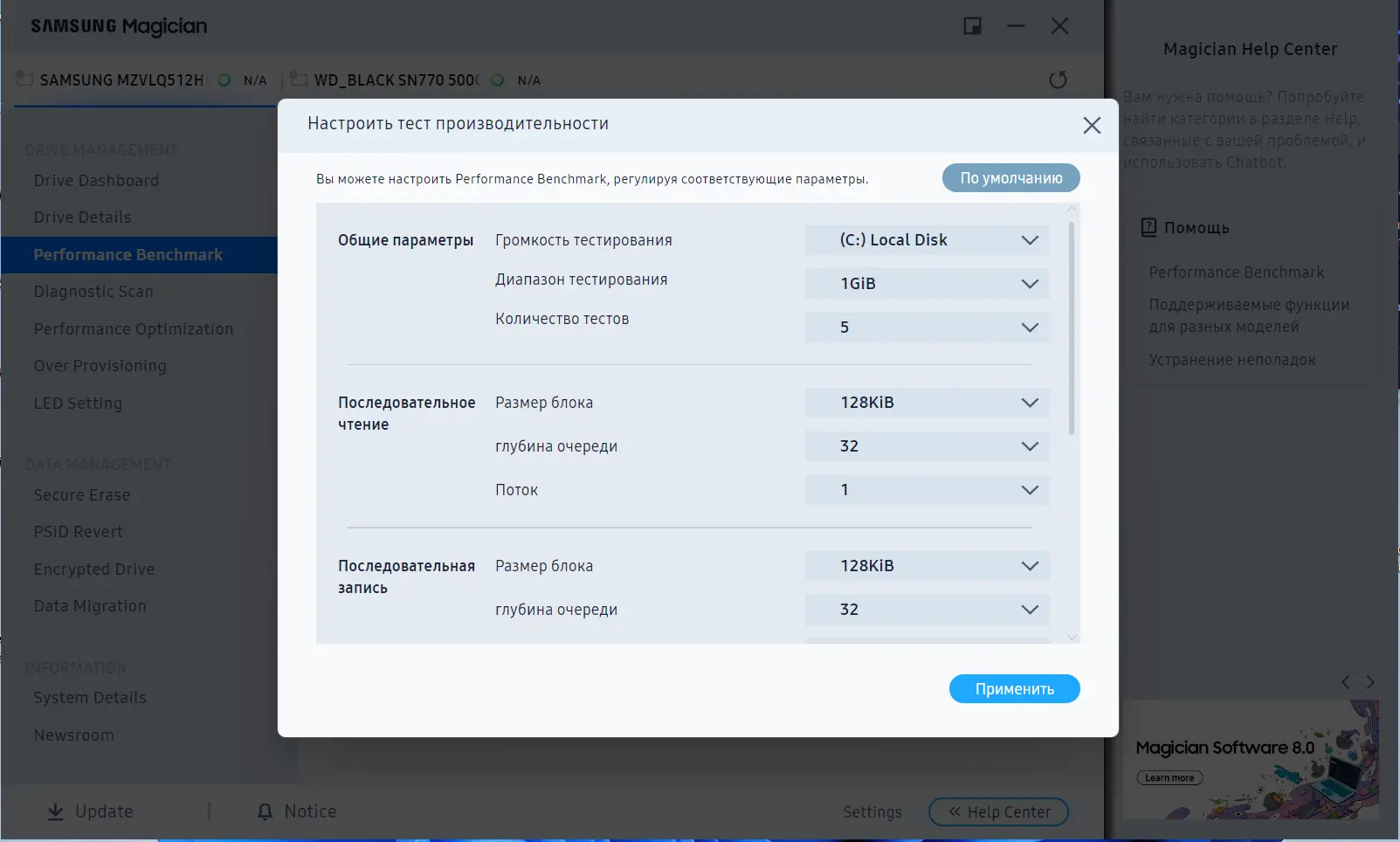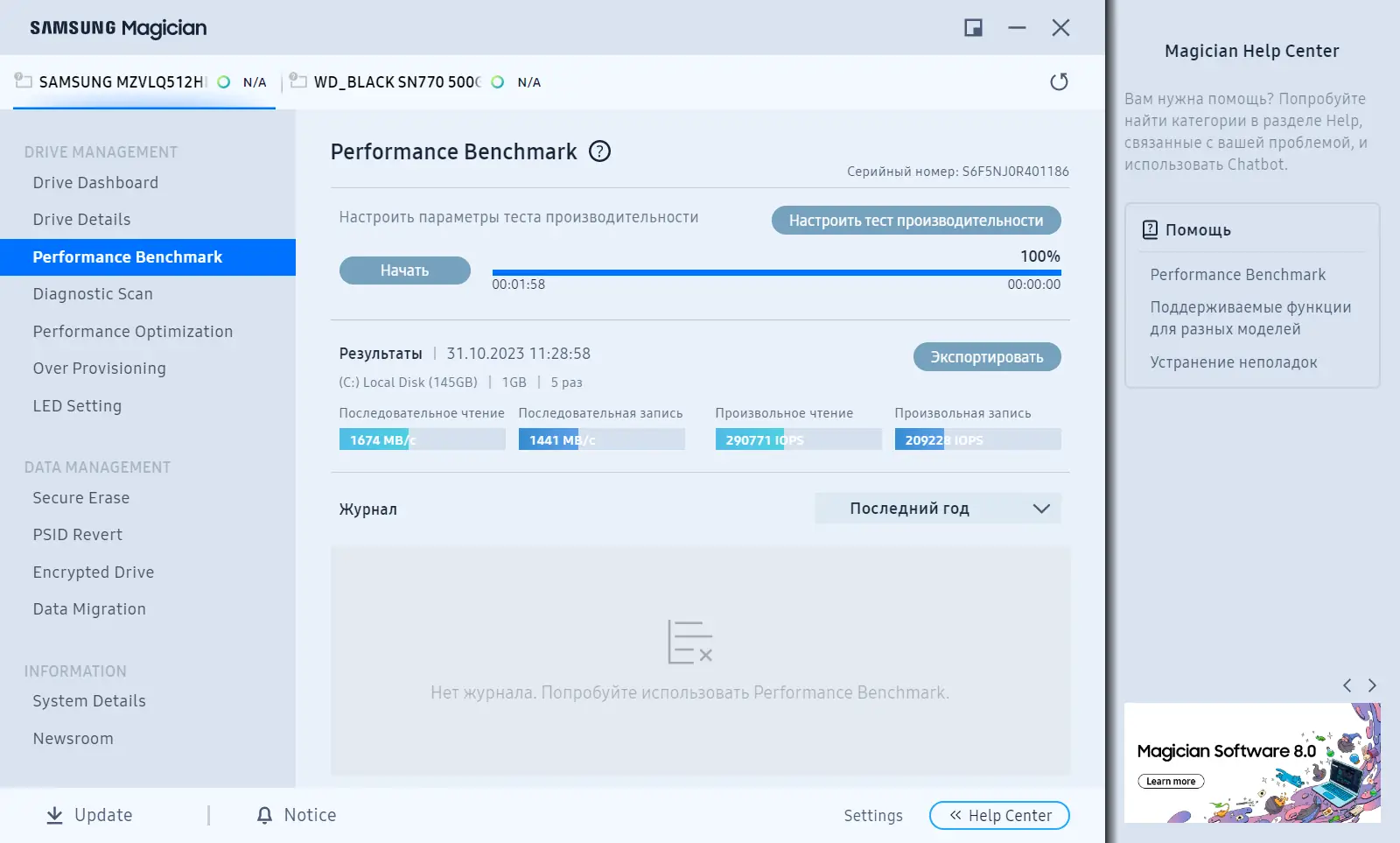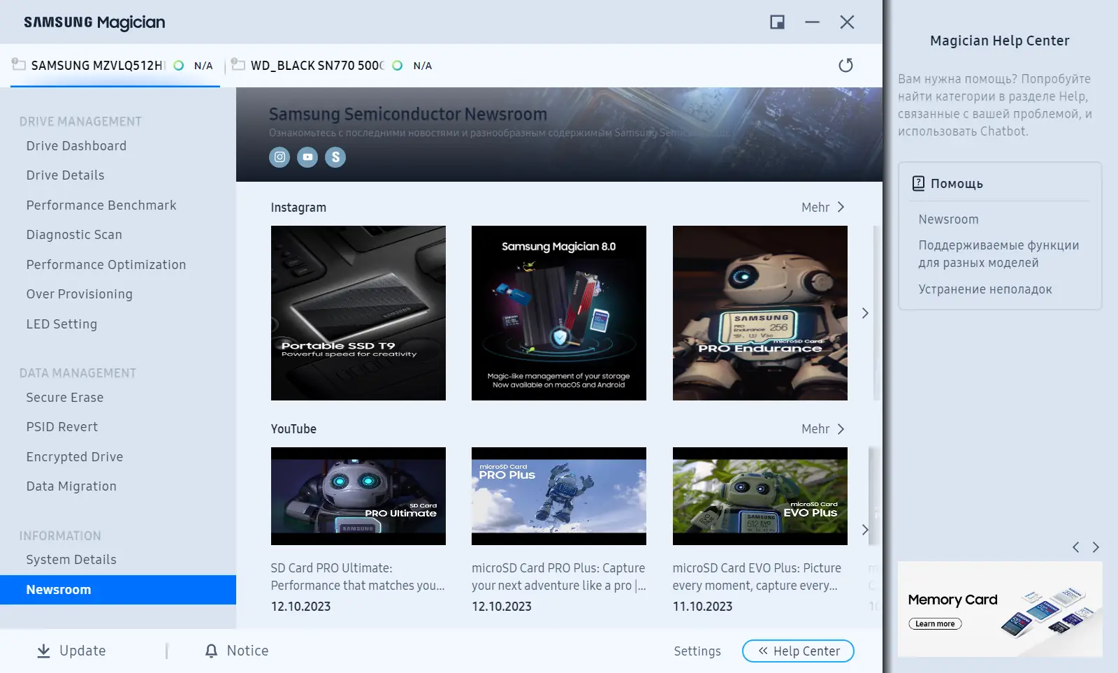 Интерфейс программы интуитивно понятен и разделён на логические блоки, что упрощает навигацию. После запуска отображается список всех подключённых SSD Samsung с краткой сводкой по каждому устройству. Для запуска теста производительности достаточно выбрать нужный диск и нажать соответствующую кнопку, после чего программа автоматически выполнит серию операций и выведет результаты. Обновление прошивки инициируется в отдельном разделе, где также доступна история изменений и рекомендации по установке.