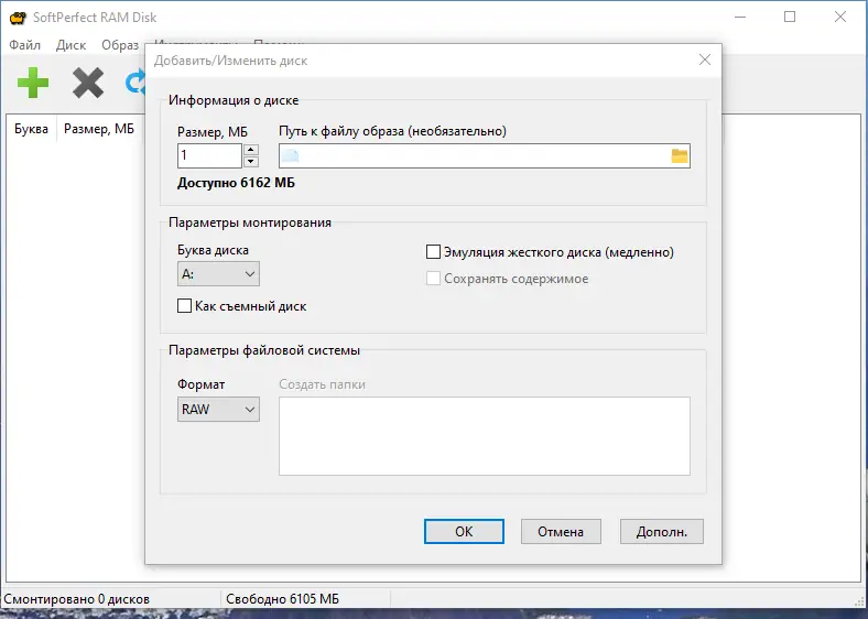 SoftPerfect RAM Disk представляет собой инструмент, предназначенный для создания одного или нескольких виртуальных дисков, размещаемых исключительно в оперативной памяти компьютера. Благодаря высокой скорости доступа к RAM, все операции с файлами на таком диске выполняются практически мгновенно, что делает его идеальным решением для хранения временных данных, кешей браузеров, подкачки и других часто используемых, но не требующих постоянного хранения файлов. Программа поддерживает настройку размера диска, букву тома, файловую систему и режим сохранения данных при выключении.