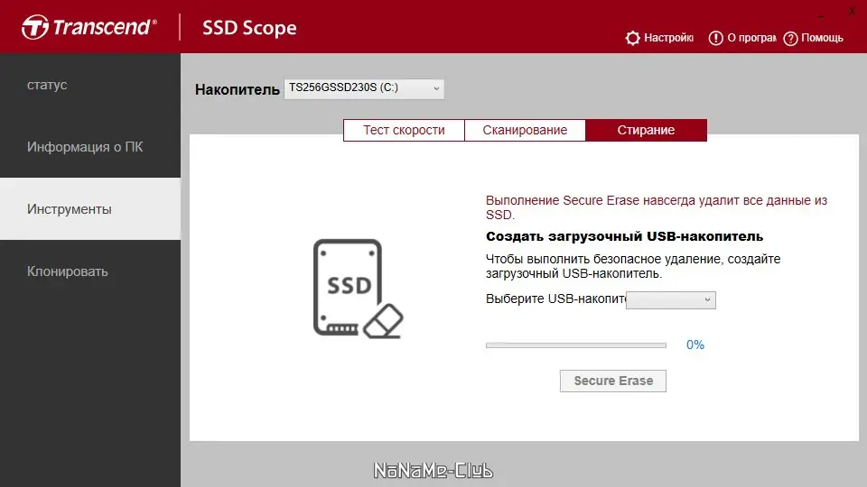 Интерфейс приложения интуитивно понятен и организован в виде вкладок, каждая из которых отвечает за определённый аспект работы с накопителем. После запуска программа автоматически определяет подключённый SSD, отображая его основные характеристики. Пользователь может перейти к тесту производительности, который занимает несколько минут и показывает реальные скорости последовательного и случайного доступа. Для проверки здоровья диска доступен режим диагностики, использующий данные S.M.A.R.T. и сигнализирующий о критических показателях. Также предусмотрена функция выполнения TRIM, которая рекомендуется для регулярного использования. При необходимости полного удаления данных предусмотрен режим безопасного стирания, уничтожающий информацию на уровне секторов. Дополнительно реализована утилита клонирования, позволяющая перенести операционную систему и данные на новый SSD без переустановки Windows.