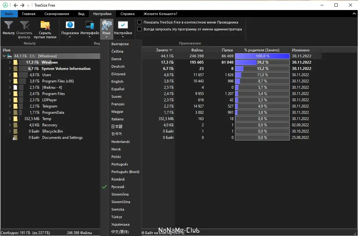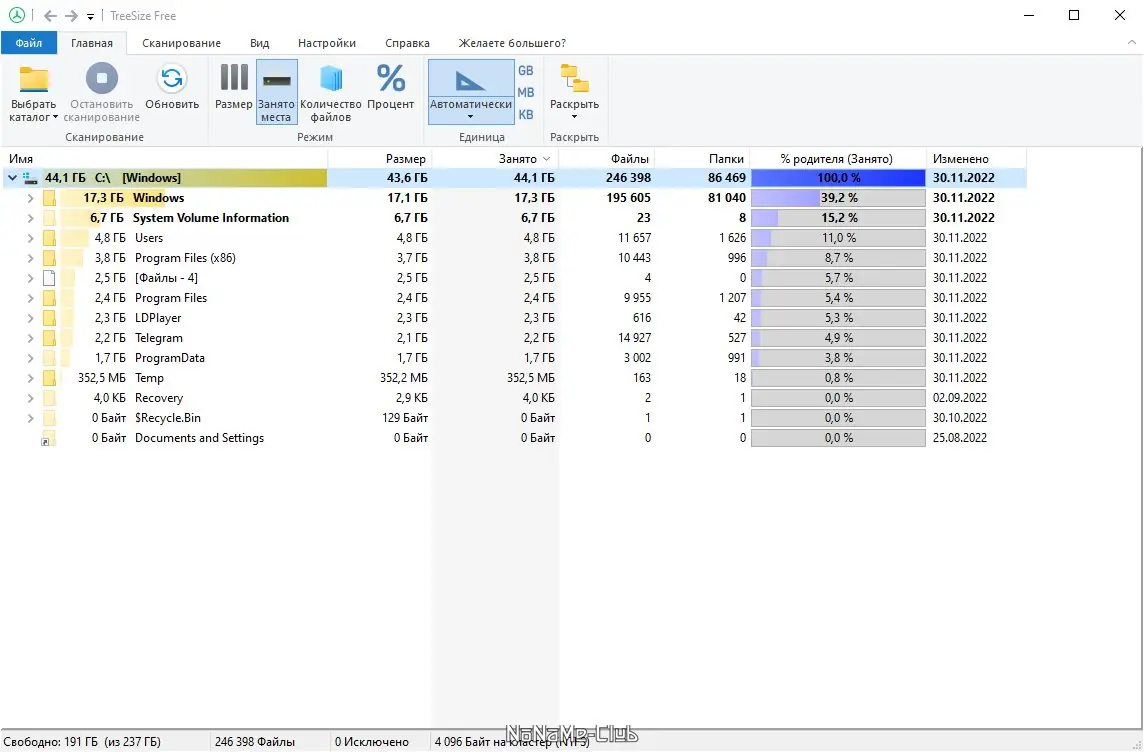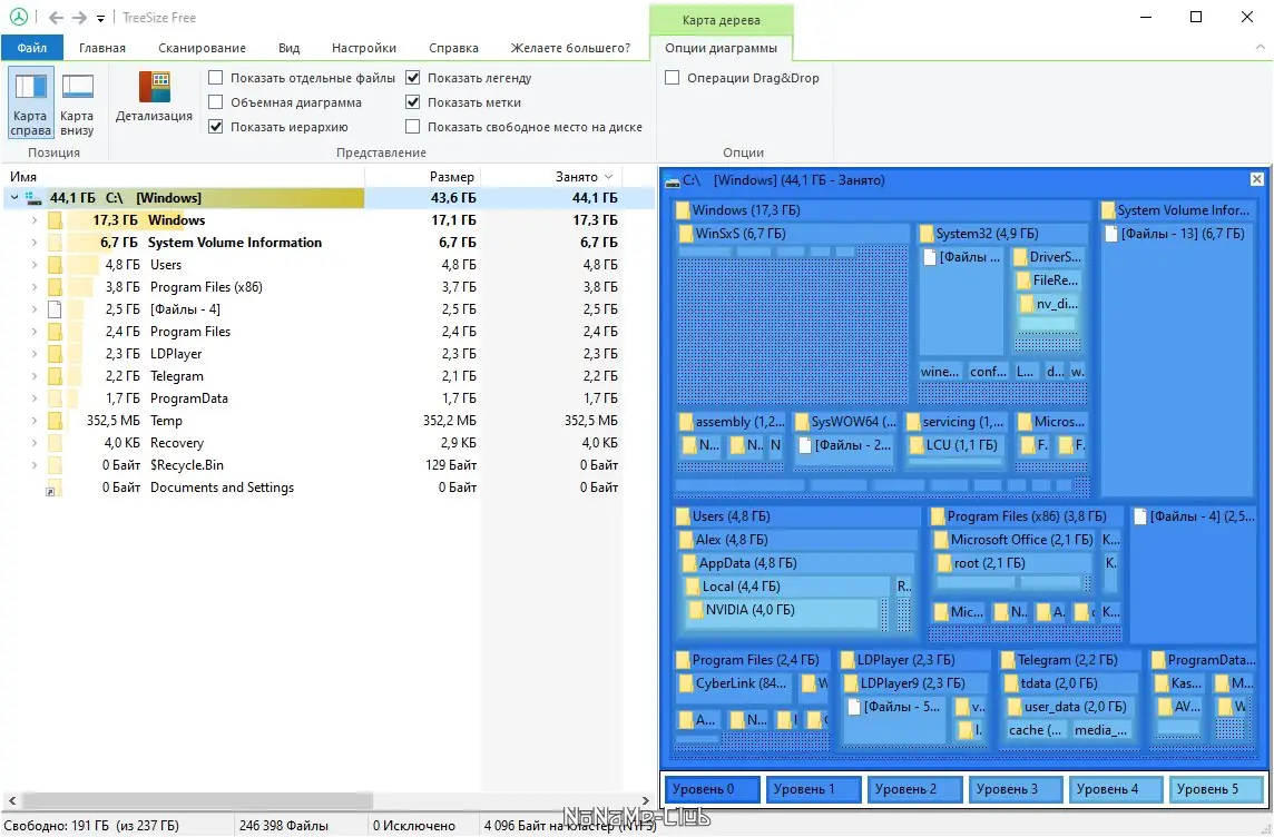 - TreeSize работает напрямую с главной файловой таблицей NTFS, что обеспечивает высокую скорость анализа даже на больших томах.