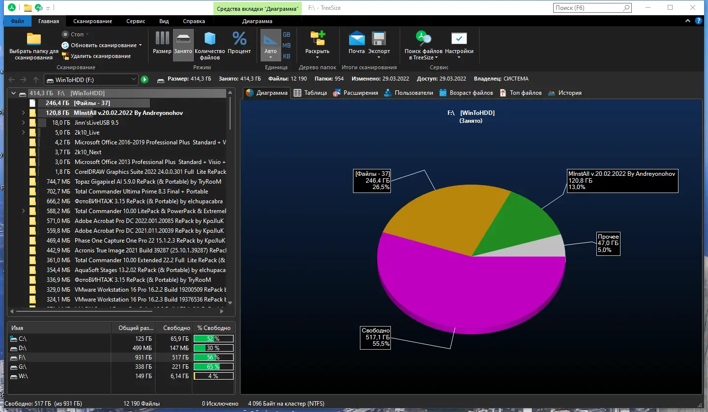 - Позволяет визуализировать использование диска через гистограммы, круговые диаграммы и древовидные карты для наглядного восприятия распределения данных.