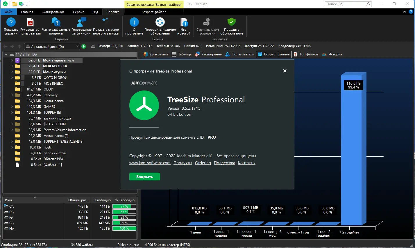 TreeSize Professional — это мощное решение для анализа и управления дисковым пространством в операционных системах Windows. Программа быстро сканирует жёсткие диски, отображая объём данных в каждой папке и подпапке, а также предоставляет детальную информацию о файлах: размер, владелец, права доступа, дата последнего изменения и другие параметры. Благодаря интуитивному интерфейсу и широким возможностям визуализации, TreeSize помогает эффективно контролировать использование дискового пространства как на локальных, так и на сетевых устройствах.