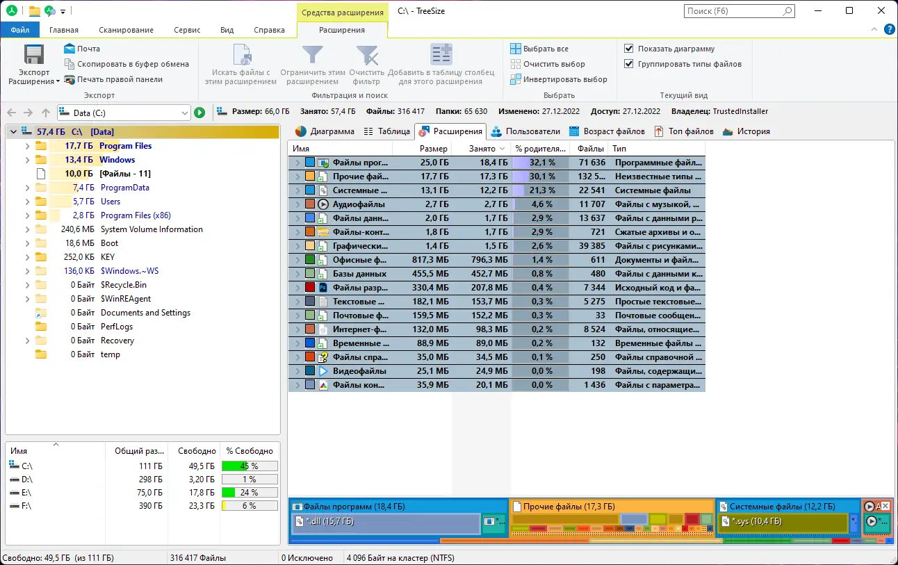 TreeSize отличается широкими возможностями анализа, высокой скоростью работы и глубокой интеграцией с операционной системой. Программа поддерживает мультиязычный интерфейс, включая русский, и совместима с современными и устаревшими версиями Windows. Возможность запуска как в установленном, так и в портативном режиме делает её гибкой в использовании. Скачать free на русском можно без потери функциональности, благодаря качественному репаку с патчем. Однако, несмотря на обширные возможности, интерфейс может показаться сложным для новичков. В то же время опытные пользователи оценят детализацию и контроль, который предоставляет программа.