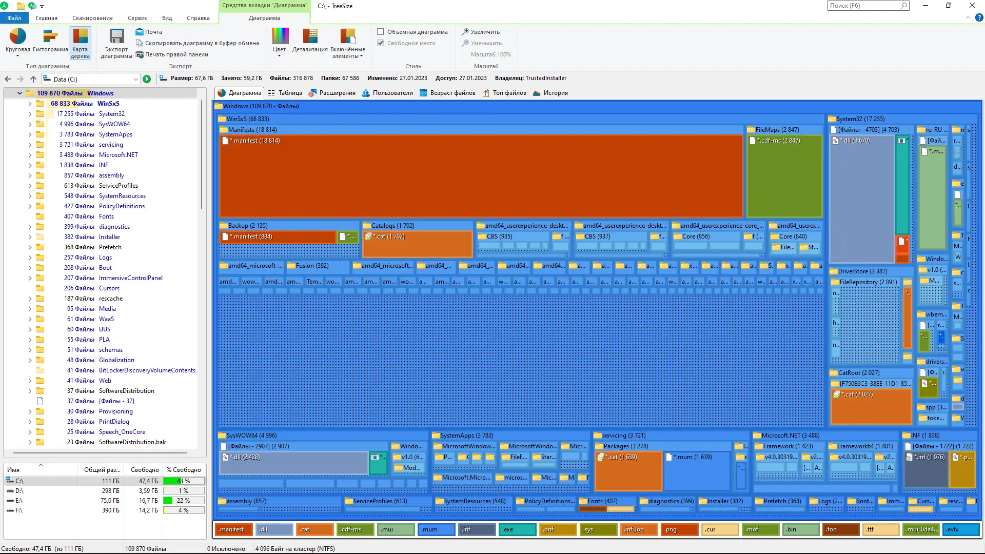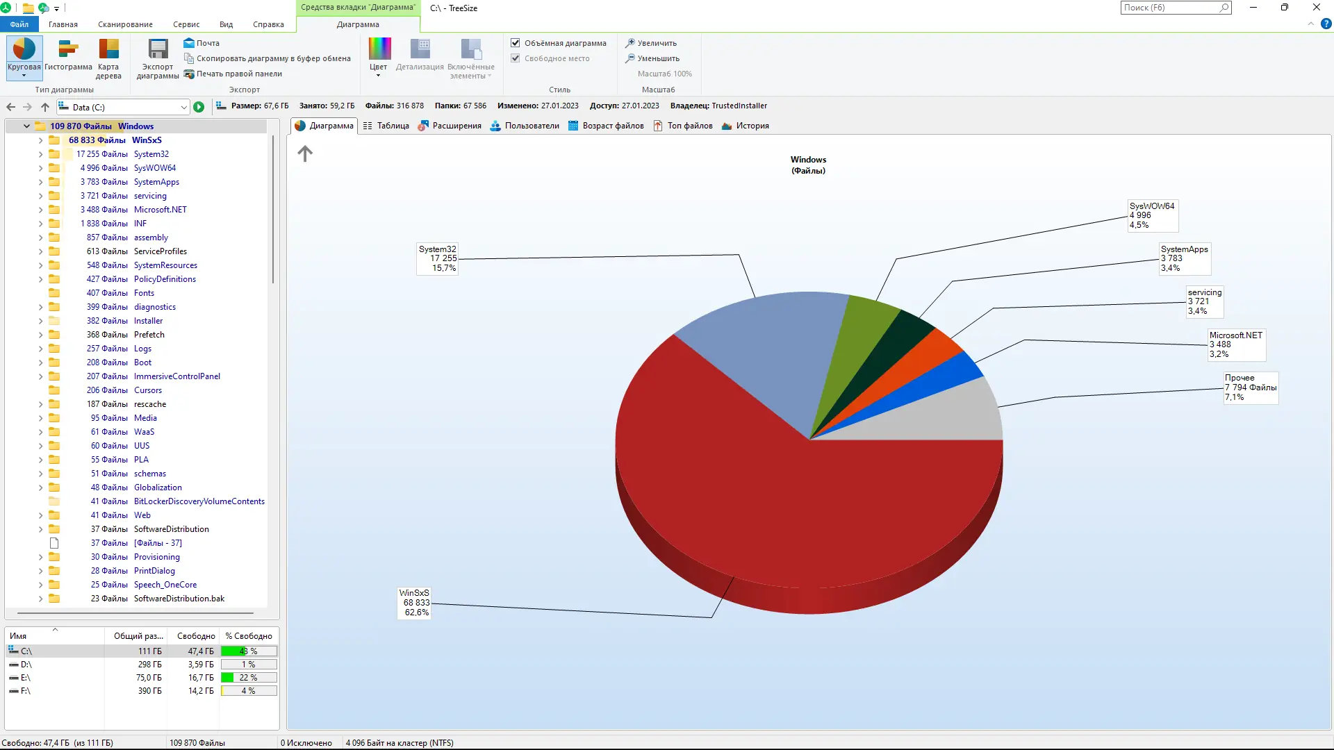 TreeSize предоставляет детальное представление о структуре папок и объёме занимаемого ими места, включая все подкаталоги и файлы. Программа отображает информацию о размере, владельце, правах доступа, дате последнего изменения и использовании NTFS-сжатия. Визуализация в виде круговых диаграмм, гистограмм и древовидных карт позволяет быстро оценить распределение данных и выявить проблемные зоны.