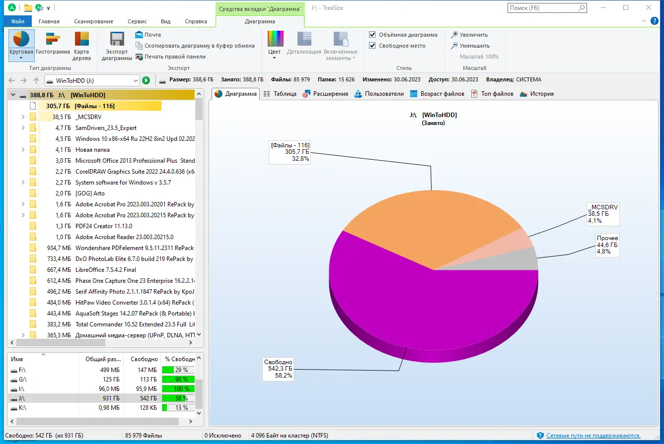 TreeSize Professional позволяет глубоко анализировать содержимое жёстких дисков, отображая не только объём данных, но и структуру хранения с детализацией до уровня отдельных файлов. Программа поддерживает сканирование локальных, сетевых и удалённых ресурсов, включая FTP, WebDAV и SharePoint. Визуальные инструменты, такие как круговые диаграммы, гистограммы и древовидные карты, упрощают восприятие распределения данных по папкам и дискам.