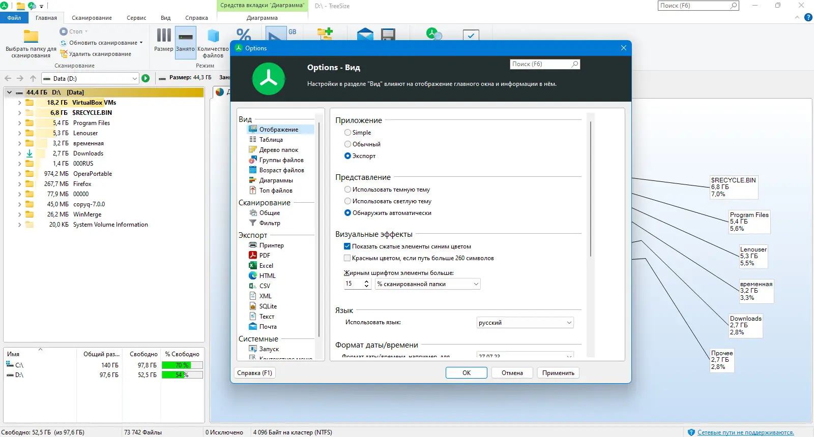 - TreeSize отображает данные в виде древовидных карт, гистограмм и круговых диаграмм для быстрого визуального анализа.