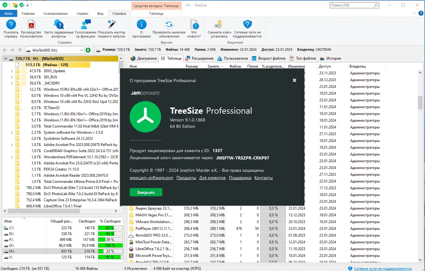 TreeSize — это мощное программное обеспечение для анализа и управления дисковым пространством в операционных системах Windows. Программа позволяет детально визуализировать структуру каталогов, быстро находить крупные и дублирующиеся файлы, а также эффективно освобождать место на жёстких дисках. Благодаря интуитивному интерфейсу и расширенным функциям она подходит как для обычных пользователей, так и для системных администраторов. TreeSize professional предоставляет полный контроль над файловой системой, включая отображение владельцев, прав доступа, дат последнего изменения и другие метаданные. С помощью встроенных инструментов можно проводить сканирование локальных и сетевых дисков, включая FTP, WebDAV и SharePoint. Результаты анализа легко экспортируются в различные форматы для последующего использования.