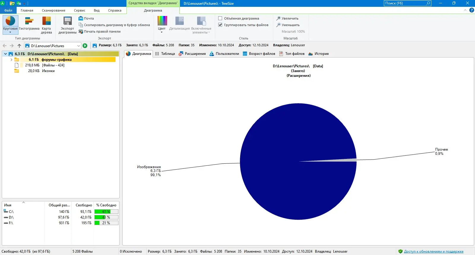 - TreeSize отображает данные в различных форматах — от классического древовидного списка до интерактивных диаграмм, включая круговые, гистограммы и древовидные карты.