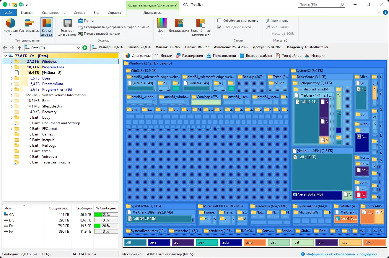 - Поддерживает визуализацию дискового пространства через диаграммы и древовидные карты
