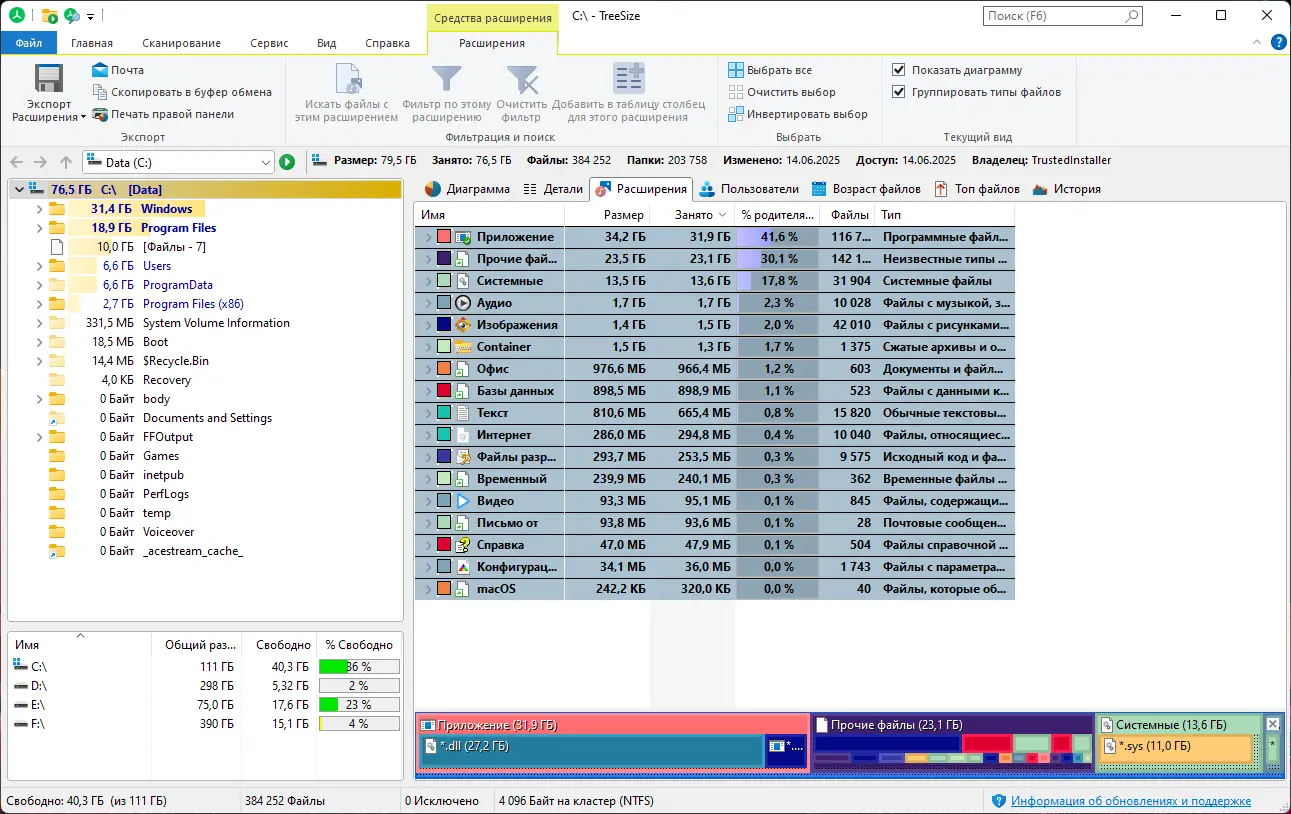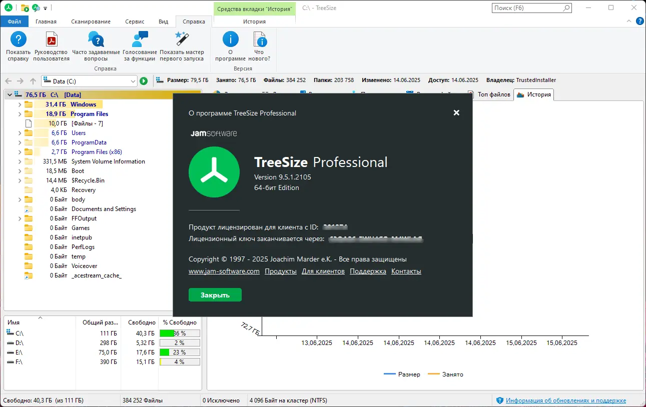 TreeSize Professional — это инструмент для анализа и визуализации использования дискового пространства на компьютере под управлением Windows. Программа отображает структуру папок с указанием размеров, позволяет находить крупные и устаревшие файлы, управлять правами доступа и сжатием NTFS, а также экспортировать данные в различные форматы для дальнейшего анализа. Её функционал особенно полезен при оптимизации хранения данных на локальных и сетевых дисках.