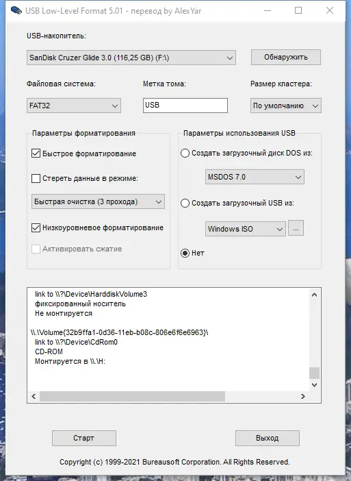 - Гибкие настройки форматирования, включая выбор файловой системы